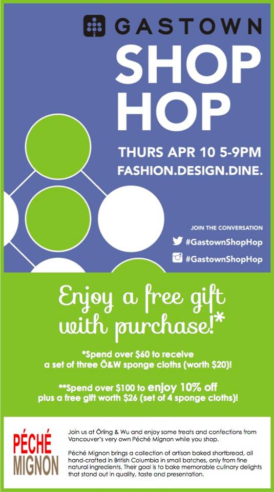 On April 10th, 2014 we are collaborating with Örling & Wu in a special in-store event as a part of the Spring edition of the Gastown Shop Hop. We will be sampling our varieties of shortbread, providing refreshments and shoppers will be able to buy on the day at special prices. In addition to setting up the pop-up shop for the public, PÉCHÉ MIGNON will be celebrating with friends, family, customers, food writers, media and other invitees in the uniquely beautiful and stylishly European setting at Örling & Wu.